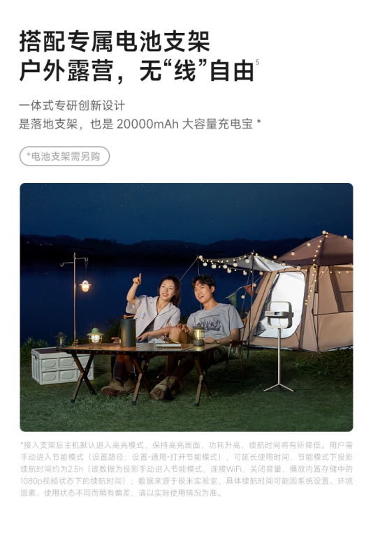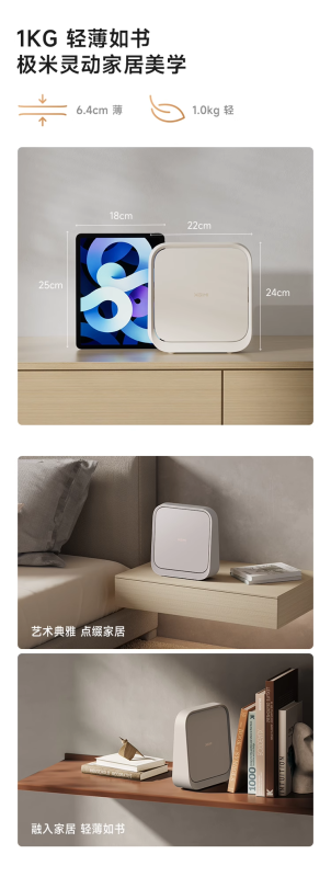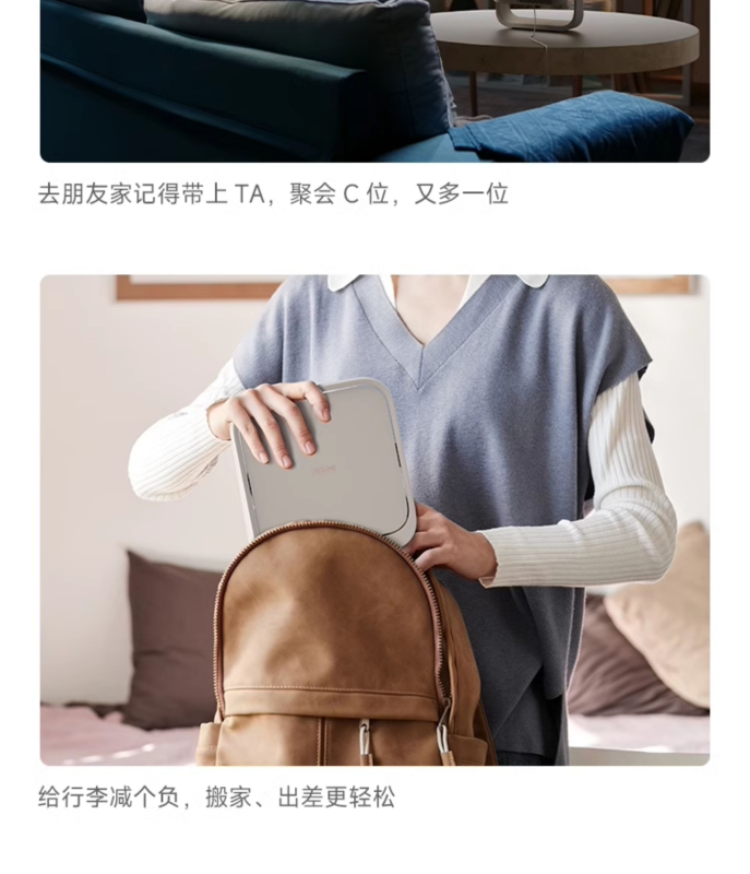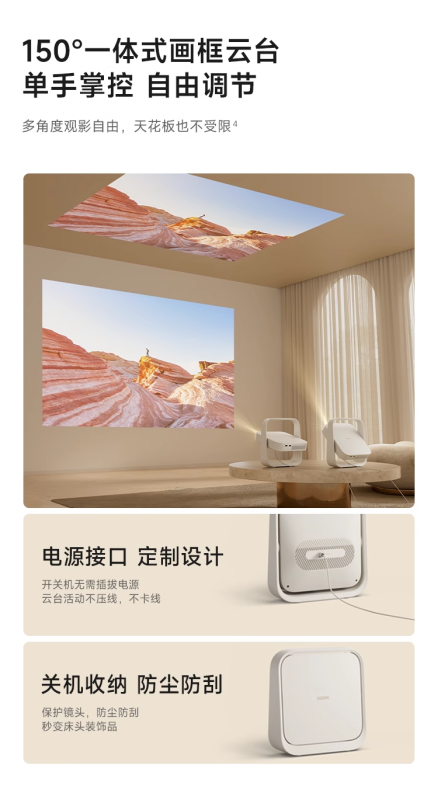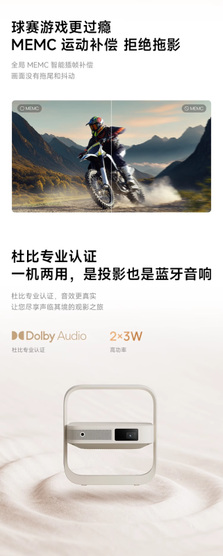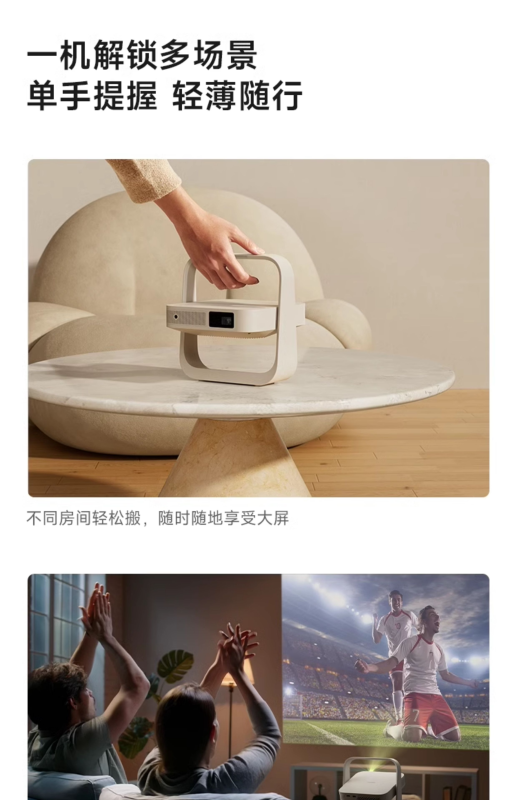 Máy chiếu này có thiết kế di động, có độ dày khoảng 6,4cm và trọng lượng khoảng 1kg. Nó được trang bị bệ khung hình tích hợp 150° và hỗ trợ chiếu lên trần nhà.