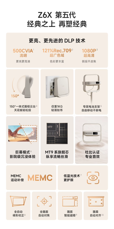 Máy chiếu XGIMI Z6X thế hệ thứ năm được trang bị chip dòng MT9 và hỗ trợ chức năng bù chuyển động MEMC và công nghệ ánh sáng xanh thấp. Máy chiếu được trang bị loa công suất 2×3W và có chứng nhận âm thanh Dolby.